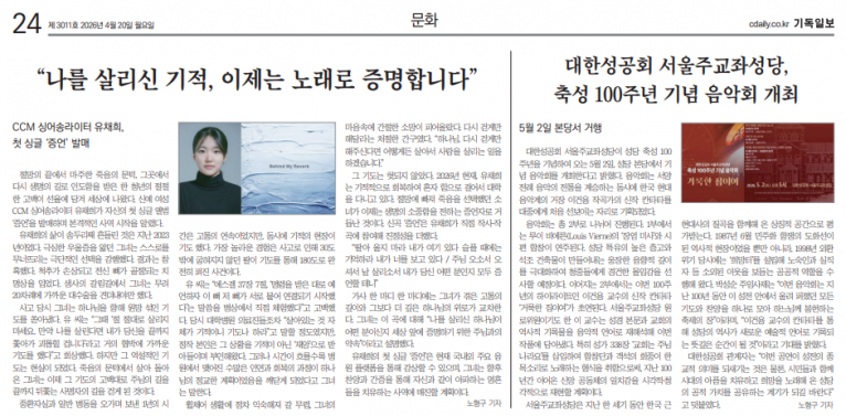 [기사] “나를 살리신 기적, 이제는 노래로 증명합니다” CCM 싱어송라이터 유채희, 첫 싱글 ‘증언’ 발매(기독일보)